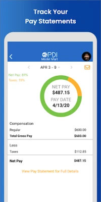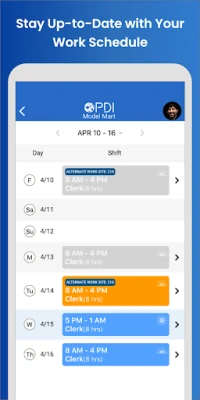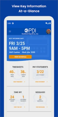 Note: This app is available for companies who have a license to use the PDI Workforce mobile application called Employee Self-Service. Feature availability depends on your company’s Workforce usage. Key features include: • Work shift scheduling • Time off requests and approvals • Timesheet processing • Pay statement delivery • Profile self-management • Message and contact sharing