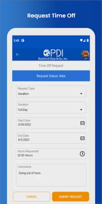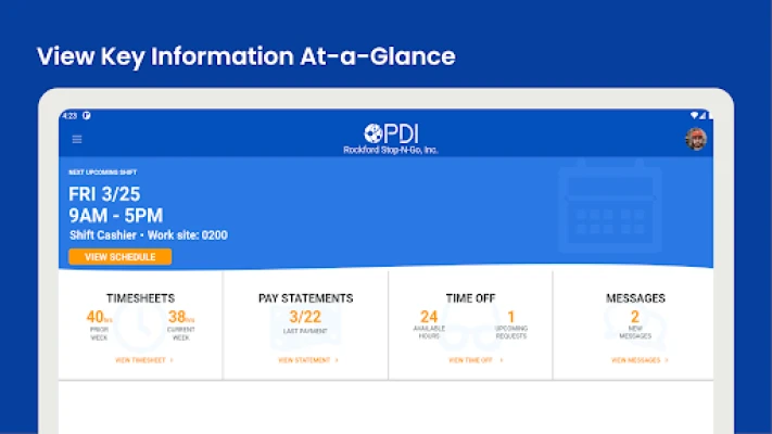 PDI Employee Self-Service provides your employees with real-time views to work shift coverage, time worked, time off, and payroll disbursements. You set alert notifications and manage an internal messaging feature. Employees check multiple work schedules, request time off, and communicate with managers and co-workers. This PDI Workforce mobile application puts transparency in employees hands.