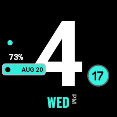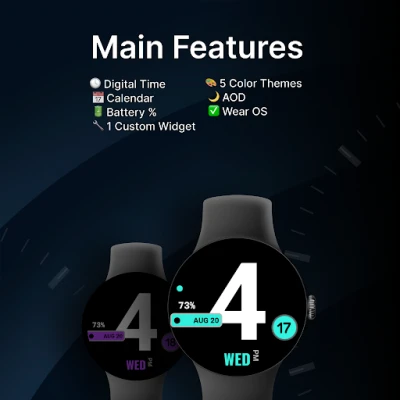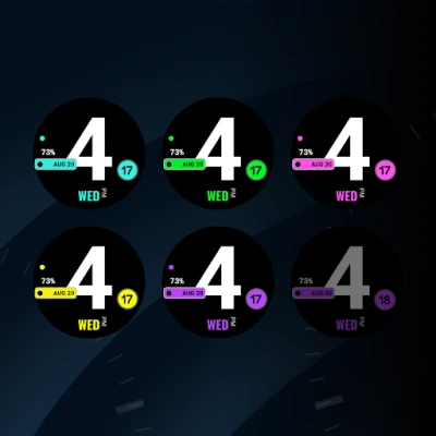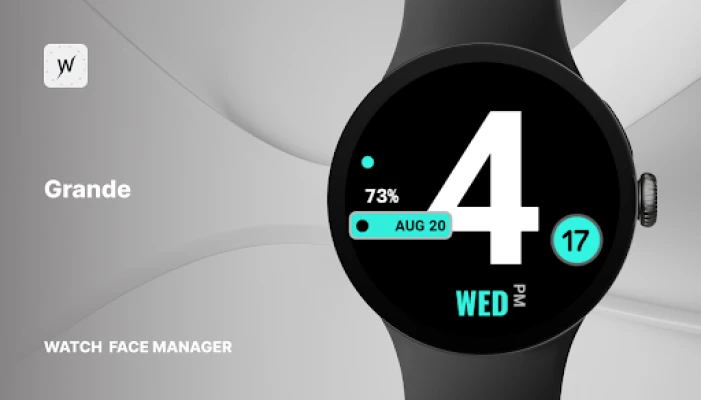 Grande is a minimalist digital watch face with an oversized time display that dominates the screen for easy readability. Designed with 5 color themes, it pairs bold design with simple, practical data.