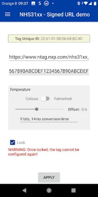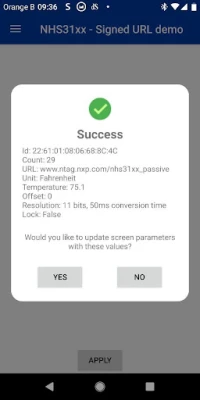 This APP interacts with the NXP’s NHS3100 IC, optimized for temperature monitoring and logging. The temperature sensor offers an absolute accuracy of 0.3℃. Each chip comes pre-calibrated and NXP provides a certificate with NIST traceability, easing the use of this IC for medical and pharmaceutical applications.