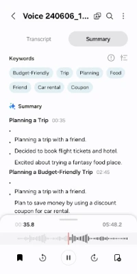 [Interview] Record yourself and another person’s voice using the microphones on the top and bottom of your phone. It shows the waveform for each voice, which you can play back separately.
